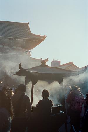 Bathed in morning light and swirling incense, visitors gather around the purification burner at Sensoji Temple. The soft haze and timeless architecture capture a fleeting, sacred stillness in the heart of Tokyo.